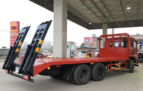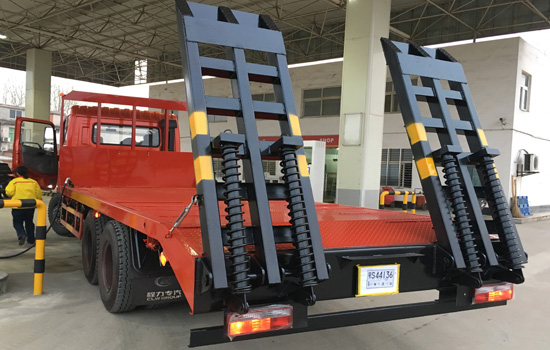 上裝配置:平板底板橫梁采用120*120*5mm方管,底板采用8mm、10mm或12mm花紋板,帶加密斜支撐,爬梯采用雙彈簧加強型設計,采用三道筋+雙彈簧加固焊接,可選裝液壓爬梯或折疊加長型液壓爬梯,斜坡處帶后支腿,平板有效板長7.5米/8米兩種可選(均含斜坡),寬2.5米(可手動伸展至3.2米),可以選擇貨箱帶欄板設計,平板離地高度1.15米,28噸及以下噸位挖機首選車型!